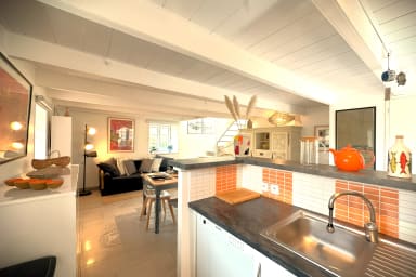 - d'une cuisine ouverte sur le séjour et équipée avec notamment lave-vaisselle, lave-linge, four micro-ondes, machine à café, bouilloire, grille-pain, etc. ;