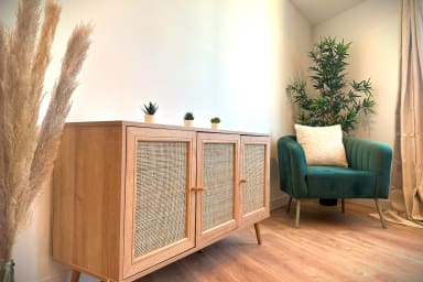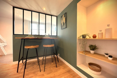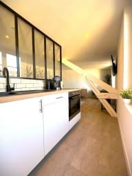 - d'une cuisine ouverte sur le séjour et équipée avec notamment, four, machine à café type Nespresso, bouilloire, etc. Vous profiterez également d'une table haute/bar ;